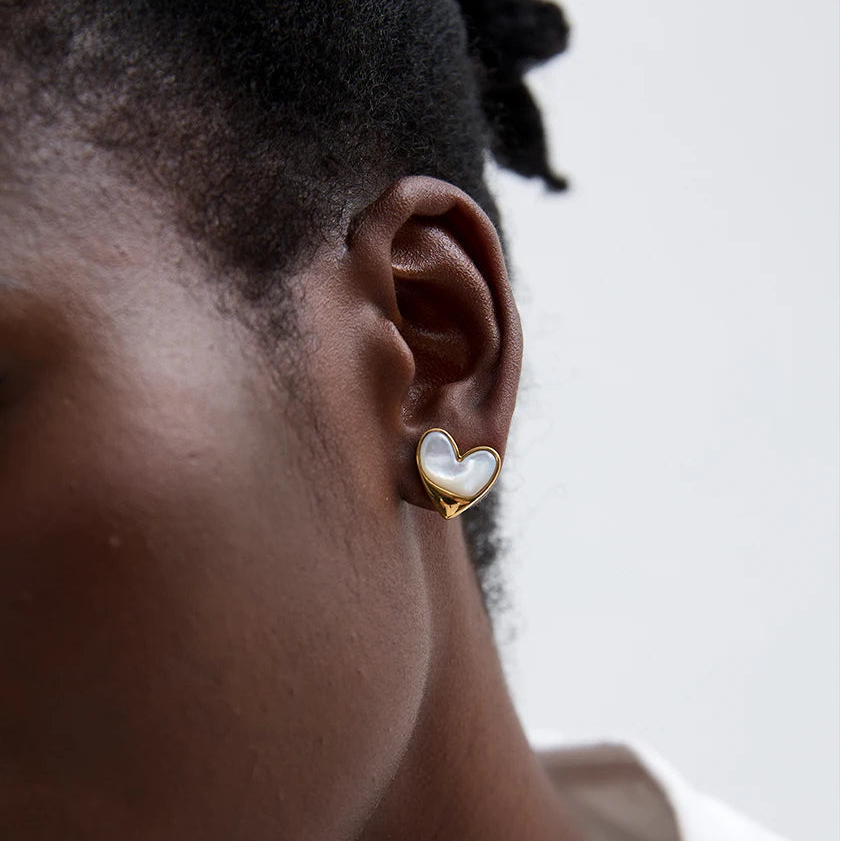 Striking oversized stud earrings in lustrous 18K gold plating, featuring iridescent mother of pearl in a distinctive organic bean shape. The Camila earrings from Alvion blend contemporary sculptural design with natural elegance, creating a bold yet sophisticated statement.