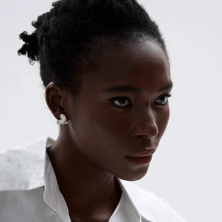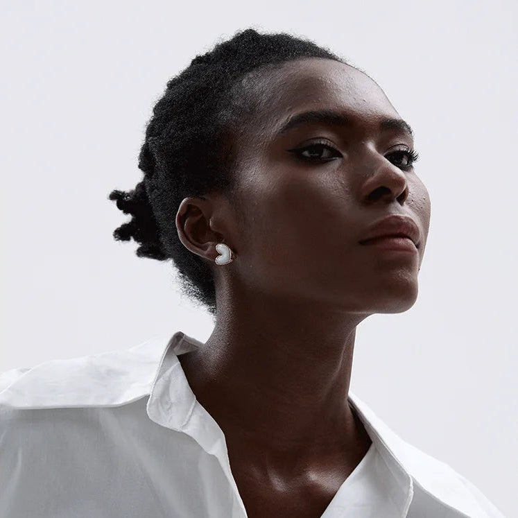 The luminous mother of pearl displays mesmerising colour shifts from white to soft blue and pink tones, whilst the chunky gold frame adds modern edge. These earrings effortlessly transition from brunch to evening cocktails, making them a versatile addition to any jewellery wardrobe.