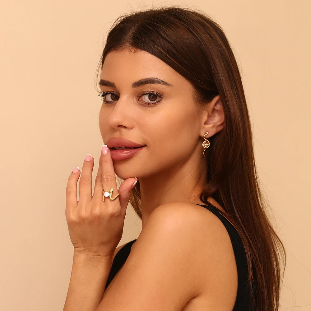 The Medusa Serpent Ring is a masterfully crafted tribute to transformation and eternal grace. Sculpted in high-polish gold-tone metal, the design features an intricately textured snake coiling elegantly around the finger. At its heart lies a stunning focal point: a large, brilliant round-cut cubic zirconia, securely held in the serpent's embrace.