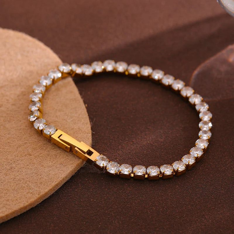 Timeless tennis bracelet in luxurious 18K gold plating, featuring a continuous line of brilliant round-cut diamond simulants. The Victoria bracelet from Alvion epitomises understated elegance and sophistication, offering red-carpet glamour for everyday luxury.