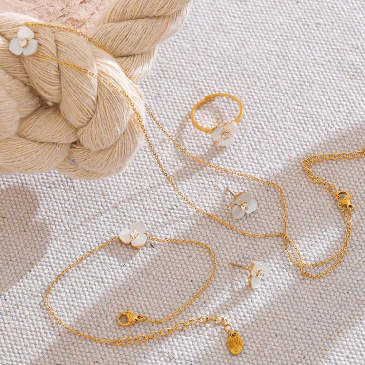 Elevate your jewellery collection with the Daizy Flower Bracelet - a sophisticated link design that embodies timeless femininity. Crafted with a repetitive motif of luminous mother-of-pearl flowers and brilliant central stones, this piece creates a delicate yet striking statement. It is the ultimate accessory for those who seek a refined, polished look with a touch of organic romance.